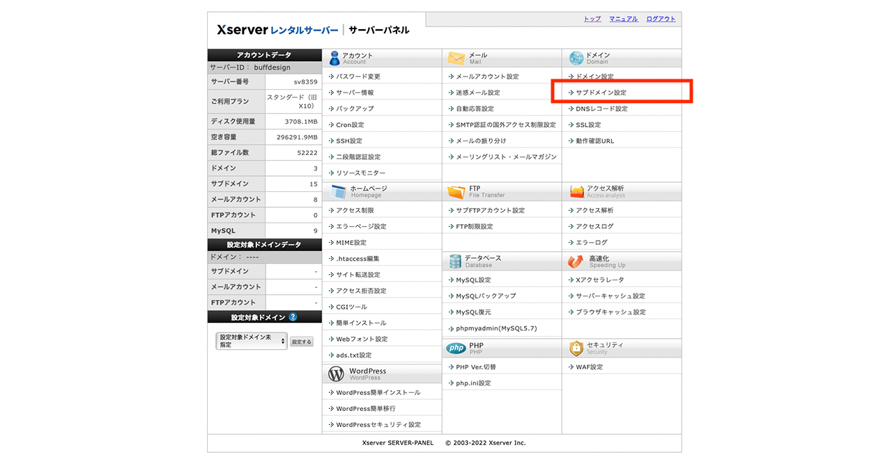 エックスサーバーのサーバーパネル画面から「サブドメイン設定」をクリックする(※赤枠部分)