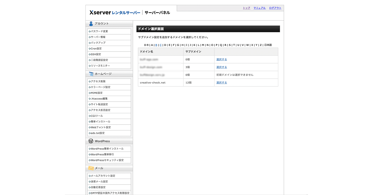ドメイン選択画面からサブドメイン設定を追加するドメインを選択します。