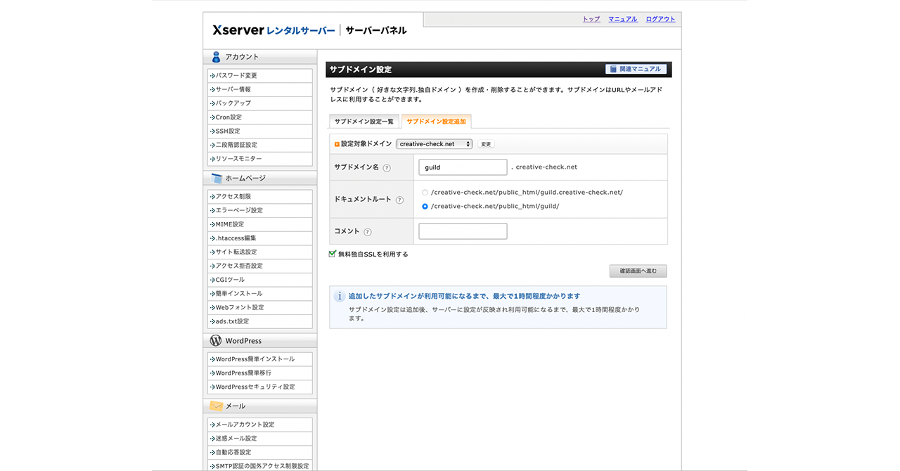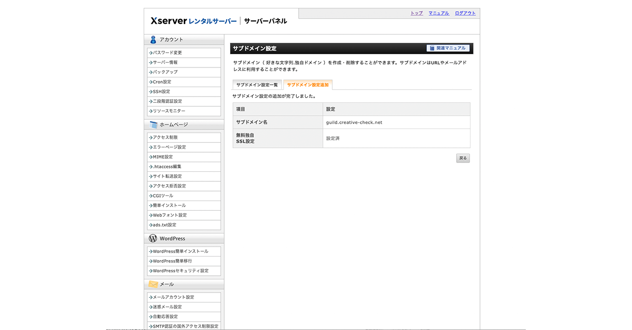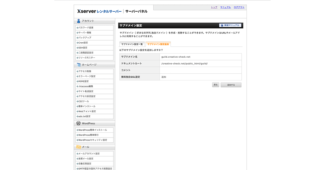「追加する」ボタンをクリックすることにより、サブドメイン設定と、無料独自SSLの設定が追加されます。